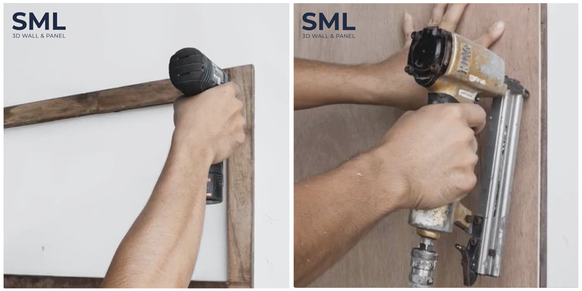 ควรเลือกไม้ให้เหมาะกับขนาดของพื้นที่ โดยก่อนการติดตั้งเราต้องปรับพื้นผิวโดยการขึ้นโครงไม้ก่อนตกแต่งผนัง เพื่อช่วยให้ไม้ยึดกับผนังได้ดี โดยระยะการวางโครงที่แนะนำคือ 30x30 ซม.หรือ 40x40 ซม. จากนั้นให้ยึดโครงด้วยปืนลม ห้ามใช้การตอกตะปูด้วยมือทั่วไปเด็ดขาดค่ะ เพราะอาจทำให้ผิวไม้เกิดความเสียหายจากแรงกระแทกและเกิดการแตกหักได้