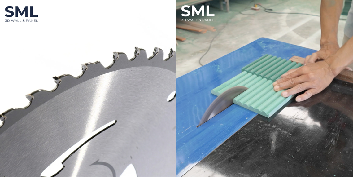 การตัดแผ่นไม้ควรใช้ใบเลื่อยชนิดฟันคาร์ไบด์จำนวนฟัน 84 ฟันขึ้นไป หากใช้ใบเลื่อยวงเดือน ควรมีจำนวนฟันมากกว่า 100 ฟัน ขึ้นไป และวางตำแหน่งใบเลื่อยให้เหมาะสมกับความหนาของบอร์ดที่ต้องการตัด และควรมีตัวนำร่องเพื่อป้องกันขอบบิ่นขณะตัด หรือใช้วิธีการตัดนำร่องก่อนตัดจริง