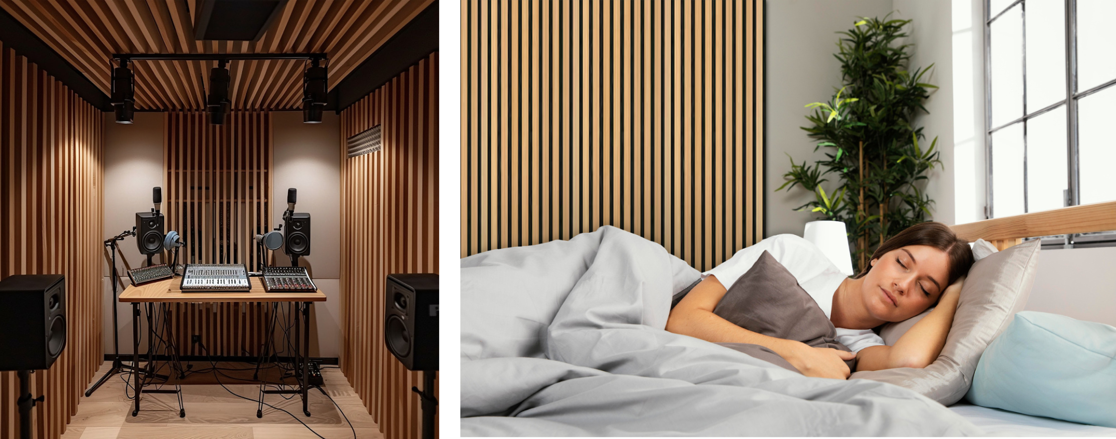 ห้องที่มีพื้นและผนังแข็งมักจะมีเสียงสะท้อนที่กร่อนประสาทหู แค่ติดแผ่นไม้ระแนงอะคูสติก VERTiCO ก็ช่วยให้เสียงนุ่มลง สร้างบรรยากาศใหม่ให้พื้นที่ของคุณ ช่วยให้บ้านเป็นสถานที่ที่ผ่อนคลายและสงบสุขจริง ๆ