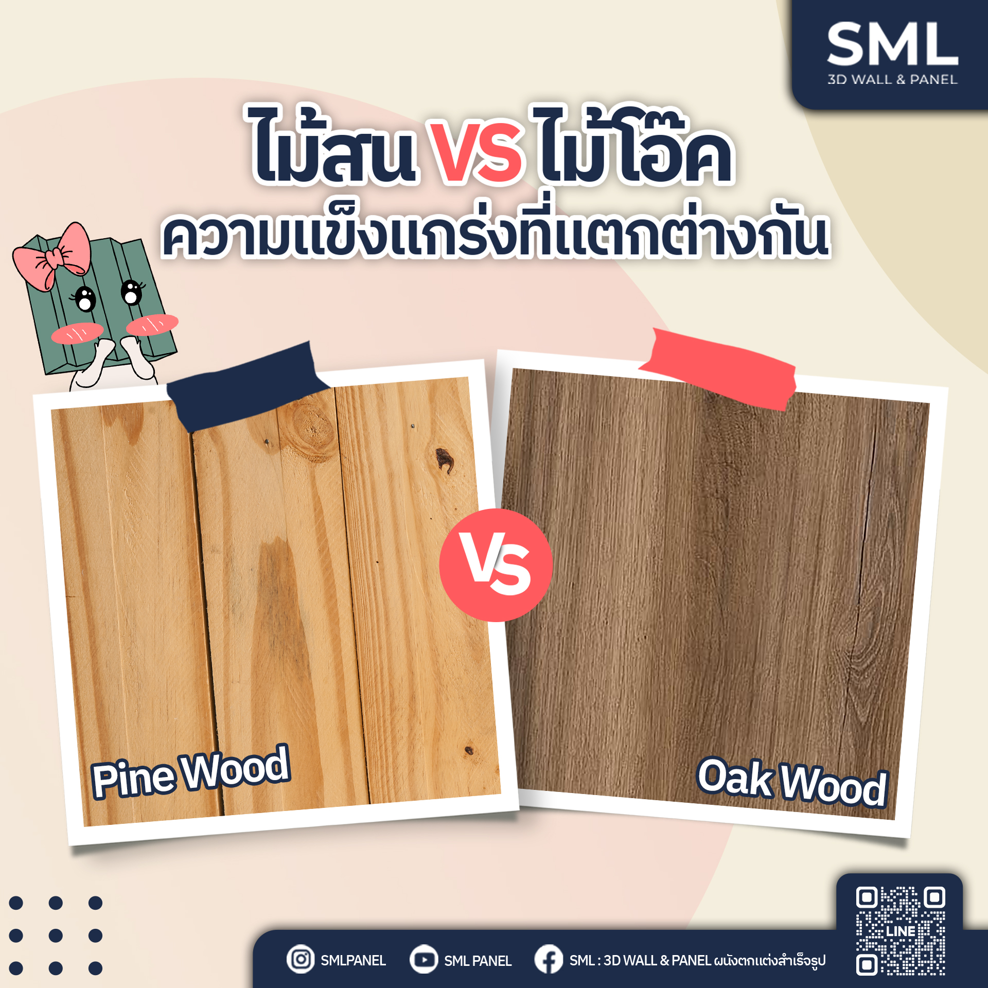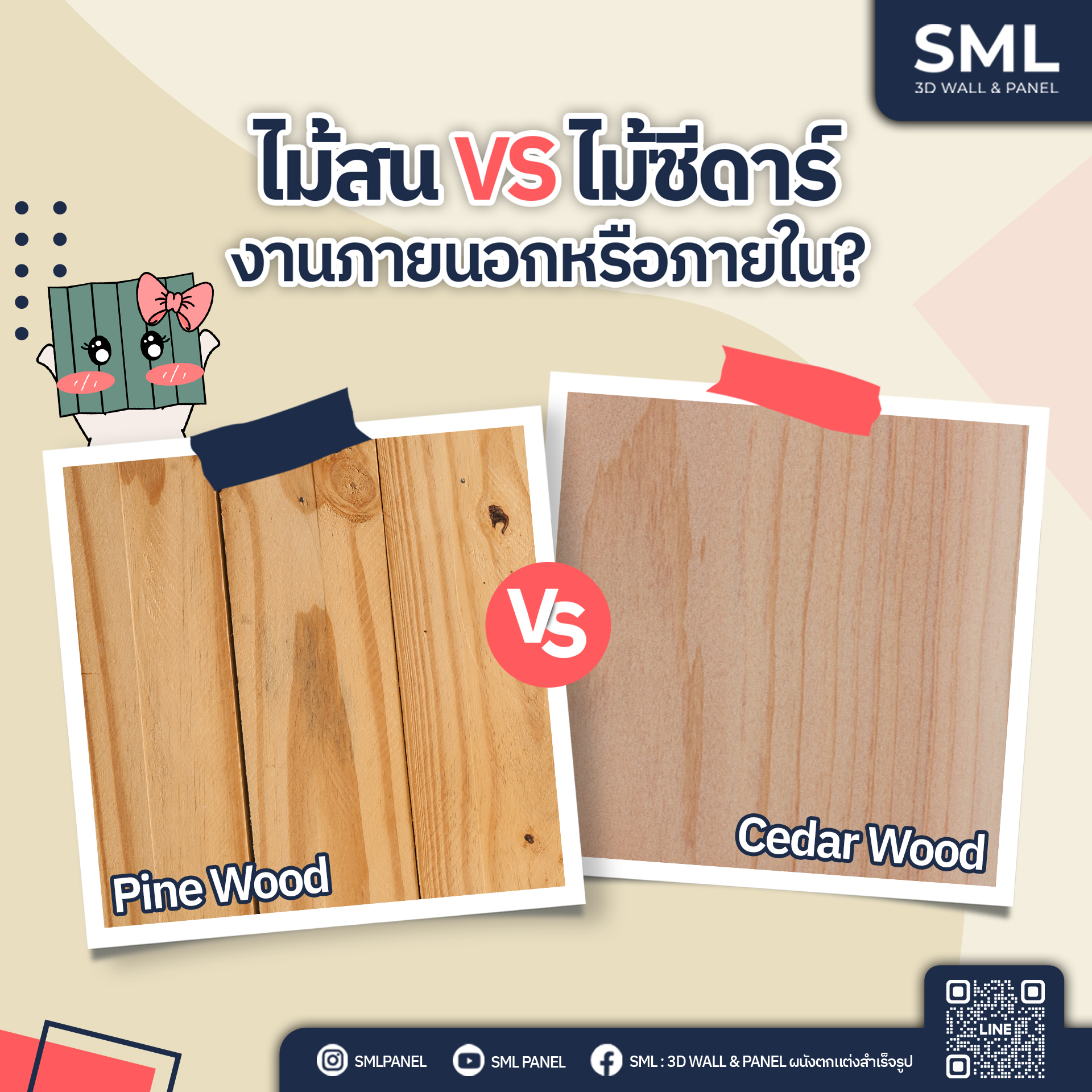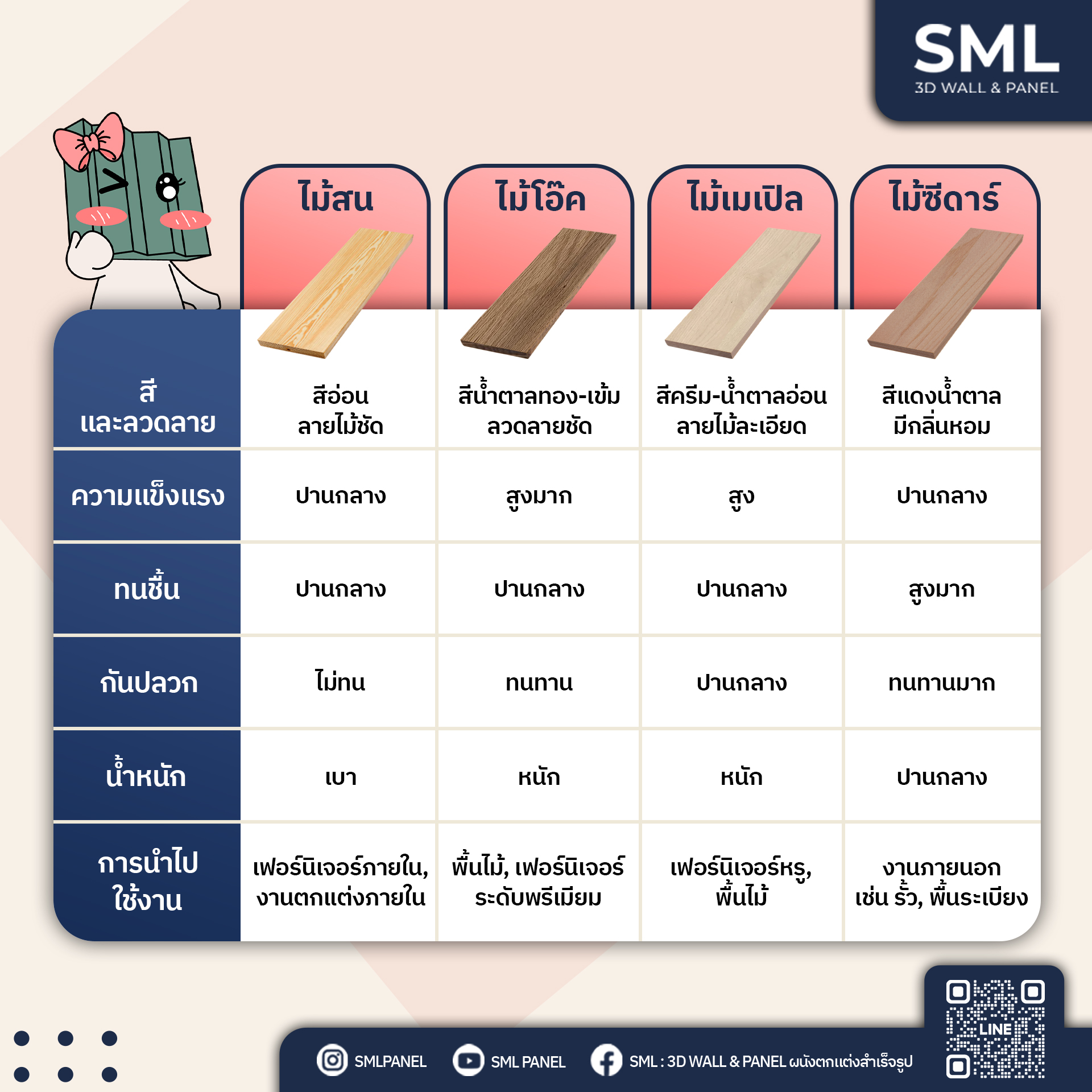 ในวงการของงานตกแต่งภายใน วัสดุที่เลือกใช้ในการตกแต่ง มีผลต่อทั้งสไตล์และฟังก์ชันของพื้นที่ ซึ่ง "ไม้" เป็นหนึ่งในตัวเลือกยอดนิยมที่ให้ความรู้สึกอบอุ่นและคลาสสิก แต่ทุกคนเคยสงสัยไหมว่า “ไม้สน” ต่างจาก ไม้โอ๊ค, ไม้เมเปิล, หรือไม้ซีดาร์ อย่างไร? ไม่ว่าจะเป็นการออกแบบ เฟอร์นิเจอร์, ผนังตกแต่ง, หรือบิวท์อิน การเลือกใช้ไม้ที่เหมาะสมจะช่วยให้ผลงานออกมาสวยงามและใช้งานได้ยาวนาน วันนี้เราจะพามาเปรียบเทียบข้อดี-ข้อเสียของไม้แต่ละชนิดว่าจะมีอะไรบ้าง ไปชมกันเลย