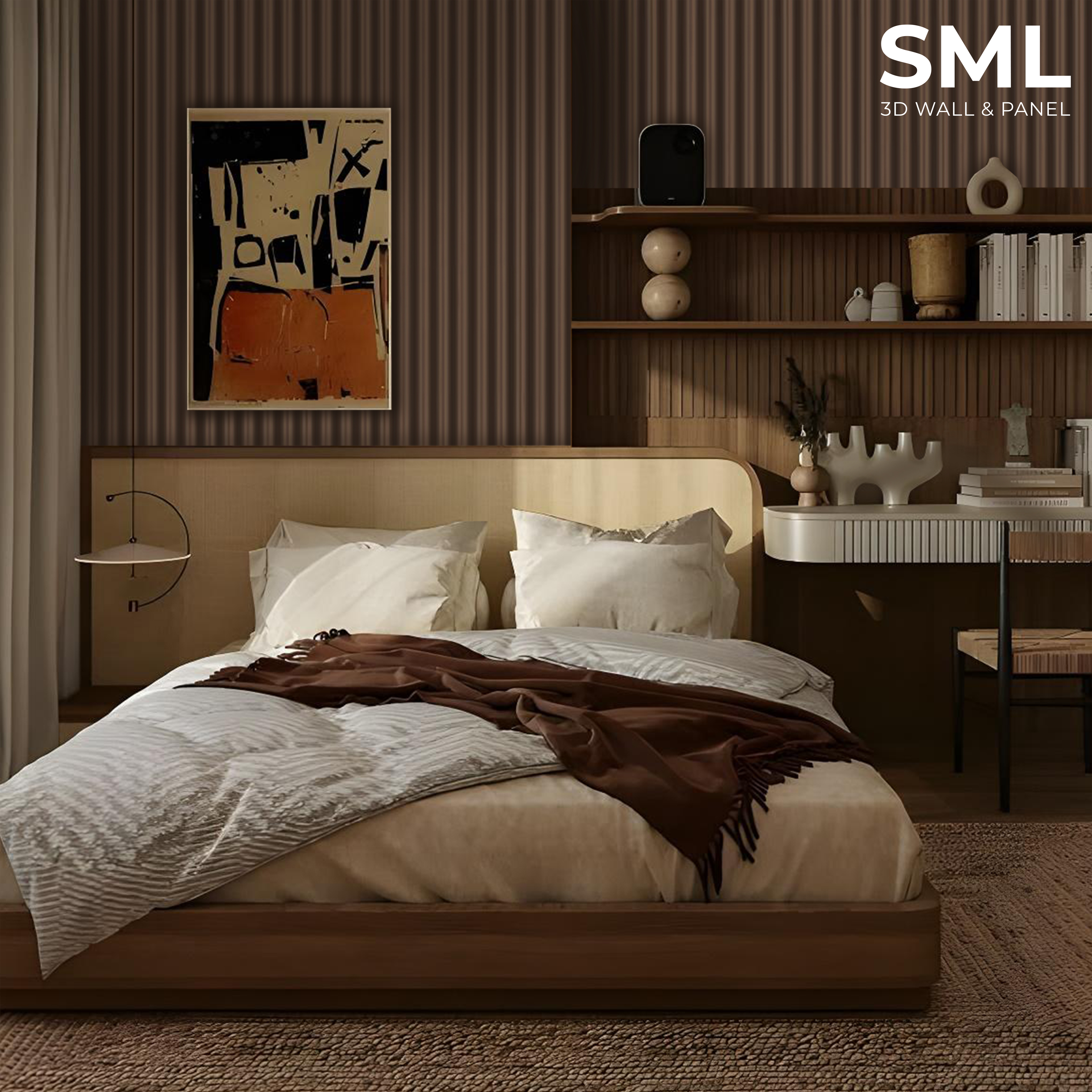 พอมาถึง ห้องนอน หลายคนชอบทำหัวเตียงหรือผนังข้างเตียงให้ดูสวยงาม ไม้ HMR เซาะร่องช่วยให้ห้องนอนมีความโมเดิร์นมากขึ้น และยังดูอบอุ่นสบายตา น่าพักผ่อน