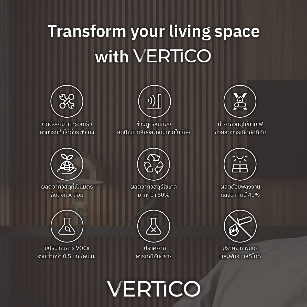 และถ้าคุณกำลังมองหาตัวช่วยในการช่วยซับเสียง และได้ห้องที่สวยในเวลาเดียวกัน VERTiCO ไม้ระแนงอะคูสติก คือทางเลือกที่ตอบโจทย์ ทำเองได้ไม่ยาก (DIY) ติดตั้งง่าย เพียงใช้กาวตะปูทาบนแผ่นแล้วติดเข้ากับผนัง ฝ้า หรือเพดาน โดยไม่ต้องเสียเวลาและงบประมาณกับการปรับโครงสร้างหรือก่อสร้างผนังใหม่