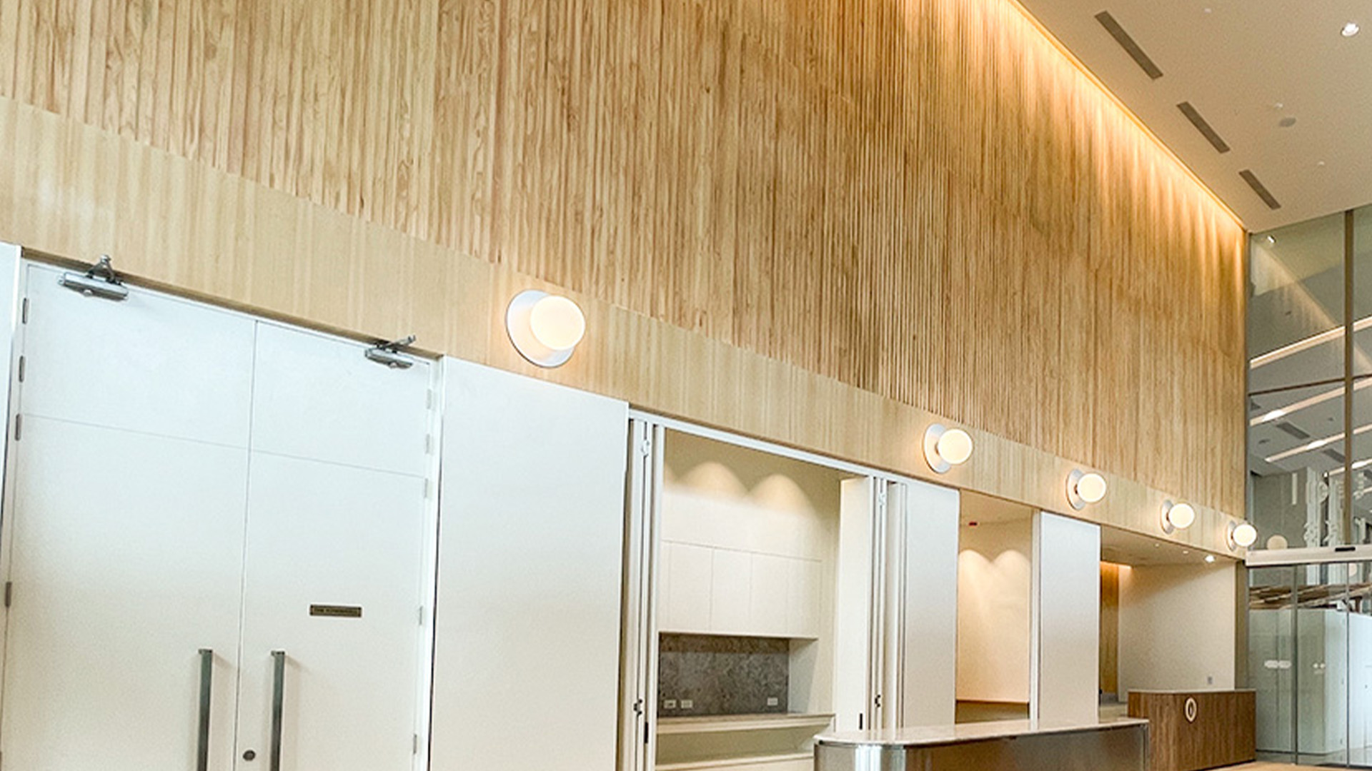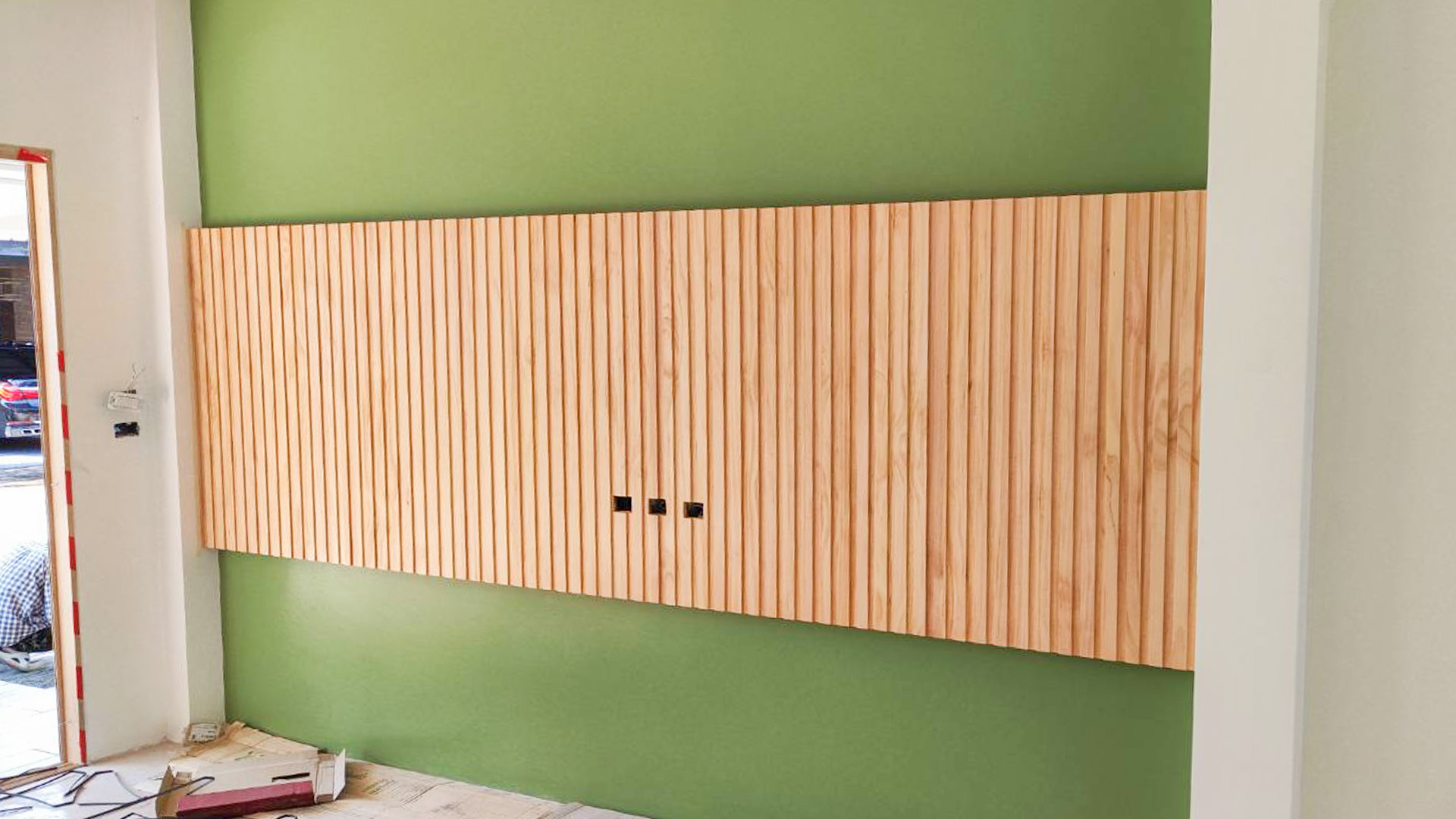 งานผนังไม้จากแผ่นไม้สนประสาน